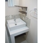 設置スペースの問題で、洗面化粧台を長年洗濯機と垂直に設置しており、横から使用していたことにお悩みでした。 洗濯機の幅を考慮して、間口ピッタリに設置でき、正面から使える造作洗面化粧台をご提案いたしました。