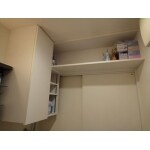 以前はつっぱり棒や市販の収納ユニットを使ってタオルなどを収納していました。 今回扉上にカウンターを、洗濯機上にはオーダーの収納家具を設置しました。 よく使うものはオープンのところに、隠したいものは扉付きのところに収納でき以前よりもスッキリしました。