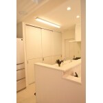 キッチンからリビングや玄関からの出入りも見わたせ、既存の階段場所も変更しキッチン脇に2階への階段を設置しましたので、ご家族の動線がいつでも確認出来る様にしました。 キッチン脇のは2階屋根からのトップライトに2階床にもトップライトを設置して、日中自然光にてキッチンが明るい空間としました。 オープンキッチンにて吊戸棚は設置せず、リビング、ダイニング空間からキッチンまで一体の空間としております。その分キッチンが見え過ぎてしまいますので、家電収納や食器棚などを隠せる3枚引き違い戸を設置しました。 キッチン奥にはパントリーと勝手口を設置しましたので、備蓄品の収納の充実や外から食料品などスムーズに運びこむ事が可能です。 対面キッチンの目の前に座ってちょうど良い高さにカウンターを設置しましたので、軽食やお子様の勉強も出来ます。 カウンター手元の壁にはモザイクタイルを貼りワンポイントにお洒落なデザイン壁と致しました。