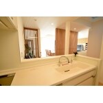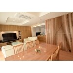 リビング・ダイニングの入口が正面となっております。天井には天井カセット型エアコンを設置して凹凸の無い空間で、入口デザイン格子引戸がスッキリとしたダイニング空間です。天井のダウンライトもLEDの調光ライトとして、暖色系と寒色系との使い分けが可能です。夜のライティングの印象は昼間と全く印象が異なります。