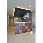 リビングダイニングに面する位置に対面カウンターを設け調理スペースに目隠しをし、キッチン正面のタイルと同じタイルを使い、市松になるようバリエーションを加えました。一部天井を下げて間接照明を仕込み、キッチンをステージのように演出しました。