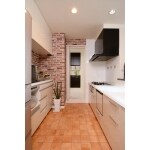 設備の交換に伴いダイニングに隣接する壁を撤去。オープンスタイルのキッチンへ改築しました。壁紙にはレンガ調のものを採用し、アンティーク風な空間を演出しています。