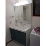 3面鏡全収納の使いやすさはそのままで、広くて平らな底面でつけ置き洗いにも最適な右奥排水口の新しいカタチをした洗面ボウルは作業効率向上の施工後