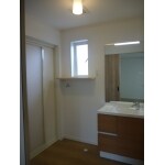 元は、車庫だった場所に洗面スペースを作りました。木目調のスッキリとしたデザインの洗面台でナチュラルテイストにまとめました。