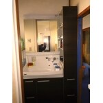 どうしてもスペースが限られてしまう脱衣場。壁に袖付きの洗面台を設置して解決です。