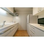 Before1と同じ方向を見る。 キッチンの向きを変え、背面収納と冷蔵庫を配した空間は以前よりコンパクトな空間にも関わらず、巾2100×奥行き650のキッチンと奥行き650の大容量の背面収納を設置できました、冷蔵庫も無理なく配置可能に。