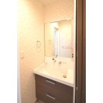 全体のプラン上、洗濯機は家事動線としてキッチンの横に設置したため、洗面は最小限の脱衣スペースとして半畳で計画。小さな部屋だけど、奥様の選んだお花柄のクロスでかわいらしい空間に。