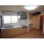 TOTOのシステムキッチンをご採用頂きました。壁はキッチンパネルを貼ることで汚れもさっと拭くだけで落とすことができます。キッチンの木目色と壁の白色でさわやかな仕上がりとなりました。