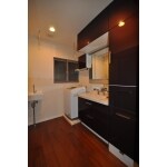 防水タイプのフローリングと茶系の洗面扉を採用し、電球色のLEDライトを設置して柔らかな雰囲気を出しました。 浴室乾燥暖房機を2室暖房にして、夏の涼と冬の暖房ができるように提案しました。 物干し金物は脱着可能な商品を提案し取付けました。
