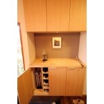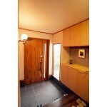玄関ドアはメンテナンスのことも考えアルミの親子ドアを採用しました。木目調のものを選び、たもの造作玄関収納やならの無垢フローリングととてもよく合っていて喜んでいただく事ができました。(概算金額に造作玄関収納、土間玄関ポーチのタイル工事含む)