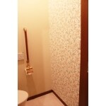 トイレの奥行きが小さくなったため足元のスペースが広くなった。今後を考えて手摺も設置。 アクセサリー等はお客様仕様にてゴールド色へ。 水のかからない壁面には輸入壁紙を貼り、ちょっとラグジュアリーな雰囲気に変身。