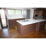 キッチンは、壁付けから対面キッチンへ。壁面に背の低いカップボードを設置し、収納量を確保しました。