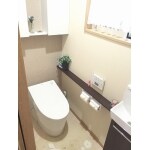 トイレはタンクレストイレを設置し、手洗い器は別に設置しました。 背面と手洗い器下に収納を設けることでお掃除道具等も収納でき、トイレをスッキリとした状態で保つことができます。