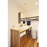 ビンテージ感を損なうことなく古材で制作した洗面は使い勝手が悪くならないよう引き出しや鏡裏の収納を設け湿気がこもらないようスリット入りの扉もつけています。オープンの棚も古材で作り、白の漆喰の壁がお互いを引き立てています。