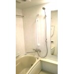 明るい色の壁パネルと、浴槽と床も白基調で選んで頂きました。 TOTOのお風呂には浴室をキレイに保つ工夫がいっぱい。ほっカラリ床はブラシでササッとして完了!鏡も浴槽もサッと拭くだけで汚れがつきにくく取りやすい、キレイを持続させやすいお風呂で人気です。