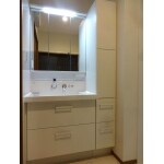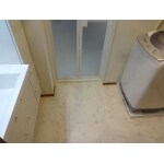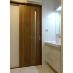 ダイニングキッチンからしか出入りが出来なかった洗面室の出入り口を廊下へ面するように変更するご提案をしました。スペースも拡張して空間にゆとりを持たせました。 出入り口は片引き戸にし、洗面化粧台、洗濯パンを交換。クロスとクッションフロアも貼替えました。