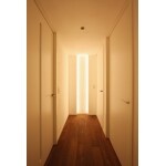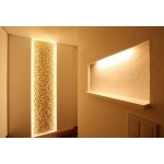 玄関から見て正面の壁にタイルを施工し、ライン照明を組み合わせました。ニッチにも照明を入れ、コントラストのある空間となりました。
