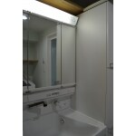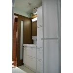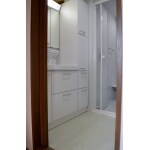 古くなった洗面化粧台も取り替えたいとのことで、浴室同様お掃除しやすい商品をご提案。収納も充実しているので、脱衣所も兼ねている空間がすっきりしました。 浴室からの湯気がこもりやすく湿気を気にする箇所のため、壁、天井には施主様がお好きな水色の塗り壁「ダイアトーマス」を施しました。