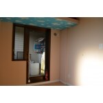 こもりやすい納戸の壁にも、調湿コントロールできる塗り壁「ダイヤトーマス」を施しました(クローゼット内にも施しました)。様々な物を置くことになるので、湿気に左右されやすい物の劣化を抑える目的もあります。天井には、もともと施主様のお好きな空のクロスが貼ってあり、施工する際に同じ空のクロスをきれいに貼り換えました。