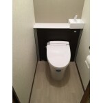 腰までタイルのトイレでしたが、タイルだと冷たさを感じるので、クッションフロアーを床、壁に貼られていました。 壁も、タイルの土間もとって、床はクッションフロアー、壁はクロスと、洋風のトイレへ! おトイレも収納も兼ねたお掃除のしやすい、トイレを提案させていただきました!