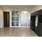 リビングを貼り分ける際の按分のバランスについては、作りつけのTVボード収納の大きさから現地に立ち、バランスのアドバイスをさせていただきました。 また、全体の色、床・壁・コンポーネントなどは3Dパースによりイメージ作りを共有しながら決めていきました。