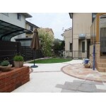 もともと土であった部分のお手入れをし易いよう全体的に固めてデザインしました。乱形石貼りと人工芝が島、洗い出しの部分が海でレンガが橋になる様にイメージしてデザインしました。人工芝の所には常緑のヤマボウシを一本植える事で、ワンちゃんが木漏れ日の中で休めるような空間に仕上げました。入り口のレンガはベンチにも使えますし、鉢を置いたりできます。