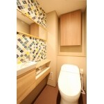 トイレはアクセントクロスを貼る予定でしたが、水はねを気にされていたこと、モロカン風がお好みとのご要望を受けて名古屋モザイクの「コラベル」をご提案しました。 元々は縦に掛かっていた鏡も横向きにして空間に奥行感が出るよう工夫しています。