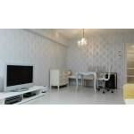 ご用意頂いた海外サイトのインテリアイメージを参考に、いくつものメーカーからサンプルを取り寄せ、その中からお選び頂きました。お客様がお持ちの家具とマッチした素敵な空間になり、嬉しい限りです。 光沢のある柄がライトに当たって浮かび上がり、とても綺麗ですね。