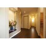 玄関を入ってすぐの場所にあった1階リビングとホールの間のドアを取り払い、角張っていたコーナー壁面の代わりに、ゆるい曲線カーブのR壁を設置しました。