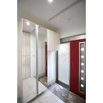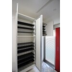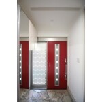 ホワイト基調の玄関に、キッチンと同様ビビッドな赤い玄関ドアを採用いたしました。また、玄関ドアの引き込み部をガラス&パンチングとすることで、プライバシーと防犯性を考慮しつつ、とても明るい玄関に仕上げました。 玄関上部に溝を設け、ここにロールスクリーンを設置することで、来客時のプライバシーも確保しています。