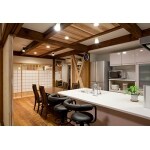 キッチンテーブルへの直線と天井の板張りをポイントにしました。