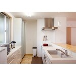 対面式キッチン。北側の窓を高くして明るくなり、背面有能で収納量もアップ。