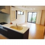 お二人のご要望を取り入れた、二色使いのキッチンです。明るいLDKの中では、シックな色合いが空間を引き締める良いアクセントとなっています