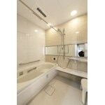 横長のミラーを採用することで、浴室全体に空間の広がりが生まれます。また、手摺をつけることで、浴槽へのまたぎが楽になります。