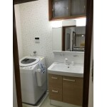 収納力の高い商品をご提案しました。 三面鏡の後ろには細かいものが入れられます。洗面台の下は、ハンドタオルなどが収納できる引き出し、そして引き扉の中には、かさの高いものも入れられます。 クロスを張り替え、明るい洗面所になりました!