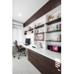 約6畳の洋室を、お仕事が捗るような書斎スペースに作り替えました。壁面には、デスクと本棚を兼ねた大きな壁面収納を造作しました。ホワイトとウォールナットの2トーンカラーで、スタイリッシュなデザインに仕上げました。また、ホワイトのウッドブラインドもお部屋を明るく感じさせてくれます。