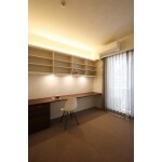 書斎スペースには、お仕事が捗る様、書棚を兼ねた大きなデスクを造りました。イームズのシェルチェアにもよく合います。手元の明るさとは別に間接照明を入れることにより、全体の明るさを確保しています。