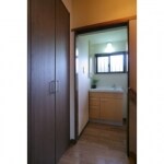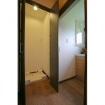 トイレへと続く通路も兼ねる洗面台は、奥行きを浅くしてしっかりと通路スペースを確保しました。 また、二世帯でも別々に洗濯をするということでしたので、扉付きの洗濯機置き場をご提案しました。