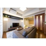 TVボード上部の棚は、60mmの厚みを持たせ、シャープさと安心感を持たせた造作家具としました。照明計画は、スクエアで薄型のシャープなシーリング・間接照明・スタンド照明で構成しました。 TVボード背面はエコカラットタイルを貼り、スタンド照明が映える雰囲気になりました。窓廻りは広さとスッキリ感を出すためホワイト&ベージュのシャープシェードをご提案しました。