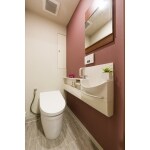 既設の鏡の板カラーに合わせてアクセントクロスを赤でご提案しました。落ち着いた朱色に床のグレーで引き締めて、女性的な雰囲気になりがちの赤系カラーもご主人も納得の空間に仕上がりました。