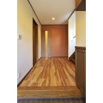 床暖房を設置すると床に段差が発生する為、廊下に扉を新設しました。扉の横の壁になる部分には 白い壁紙を貼るのではなく、色柄がハッキリとしているアクセントクロスを貼りました。 床にはフロアタイルを施工。玄関框はフロアタイルと同じメーカーのサンゲツ製の框です。