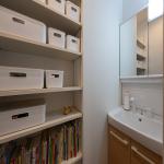 2階廊下の突き当りには、デッドスペースを利用した可動式の収納棚と、三世代家族がスムーズに朝の支度ができるよう、2台目の洗面台を設置しました。現在はお子様達の手が届く位置に本を収納し、家族みんなで共有できるファミリー本棚にしています。