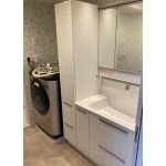 元々洗面化粧台の横に壁がありましたが、その仕切り壁をなくして収納付きの洗面化粧台にしました。タオルやその他の雑多なものが収納でき、スッキリしました。 シックな雰囲気の明るい洗面所になりました。