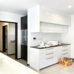 サイズ大きめのL型キッチンでした。 L型のデメリットとしては、大きいほど動線範囲が広り使いづらい場合があります。 吊り戸も幅があるため圧迫感がありました。