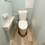 これまでは手すりがついていましたが、取り外して、木製手すり棚タイプの紙巻器にしました。スマホなどちょっとしたものを置けるスペースにもなります。自然の落ち着いた雰囲気が出せるよう、木目の棚板にし、クッションフロアは雰囲気を合わせ木目模様を採用しました。