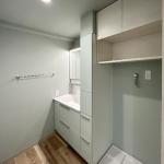 お客様のご要望にお応えし、洗面化粧台には、TOTO製「オクターブ」を採用。タッチレス&スマートな機能を備えたスタイリッシュドレッサーで、自動機能や除菌機能により毎日の使い勝手が向上し、お掃除の手間も軽減されます。 また、洗濯機置場の折戸を取り外し、作業のしやすさ、空間の美しさを保つために吊戸を設置。収納力とデザイン性を両立したレイアウトに仕上げました。 内装は、自然な温もりを感じる木目調フロアと、爽やかなブルー系の壁紙パナシェアクア色を採用。他のお部屋との統一感を持たせつつ、上品で落ち着いた雰囲気を演出します。機能性とデザイン性を兼ね備えた快適な空間をご提案いたしました。