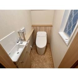 トイレは階段下にあるのですが、奥の壁を約30cm程奥に移設して、ドアの位置も奥に移動させて、ドア自体を中折れ戸にすることでゆとりのスペースを確保しました。 便器はタンクレスにして、システムカウンタータイプの手洗い器を設置しました。
