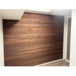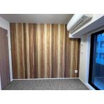 レッドシダー材のウッドパネル張り。温かみとリズム感のある木目調パネルが壁面の心地よいアクセントになりました。床はタイルカーペットを置き敷き。