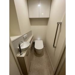 タンクレストイレに交換し、スッキリとしたデザインへ一新。 タンクがないことで、圧迫感が軽減。 新たに独立型の手洗器を設置することで、使い勝手も向上。 水はねによるお掃除の手間も軽減され、より快適な空間となりました。