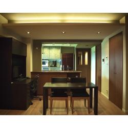 ・間接照明と明るすぎない壁紙でホテルライクを演出 ・キッチンの壁を撤去し開放的に ・上貼りフローリングの採用で予算削減